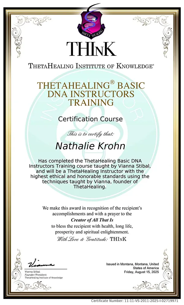 In meinen ThetaHealing®-Ausbildungen lernst du, dich selbst in diesen heiligen Zustand zu führen, Blockaden zu erkennen und zu lösen, für dich und für andere. Du lernst, der Stimme der Schöpfung zu lauschen, deiner Intuition zu vertrauen und Heilung in Leichtigkeit zu wirken.